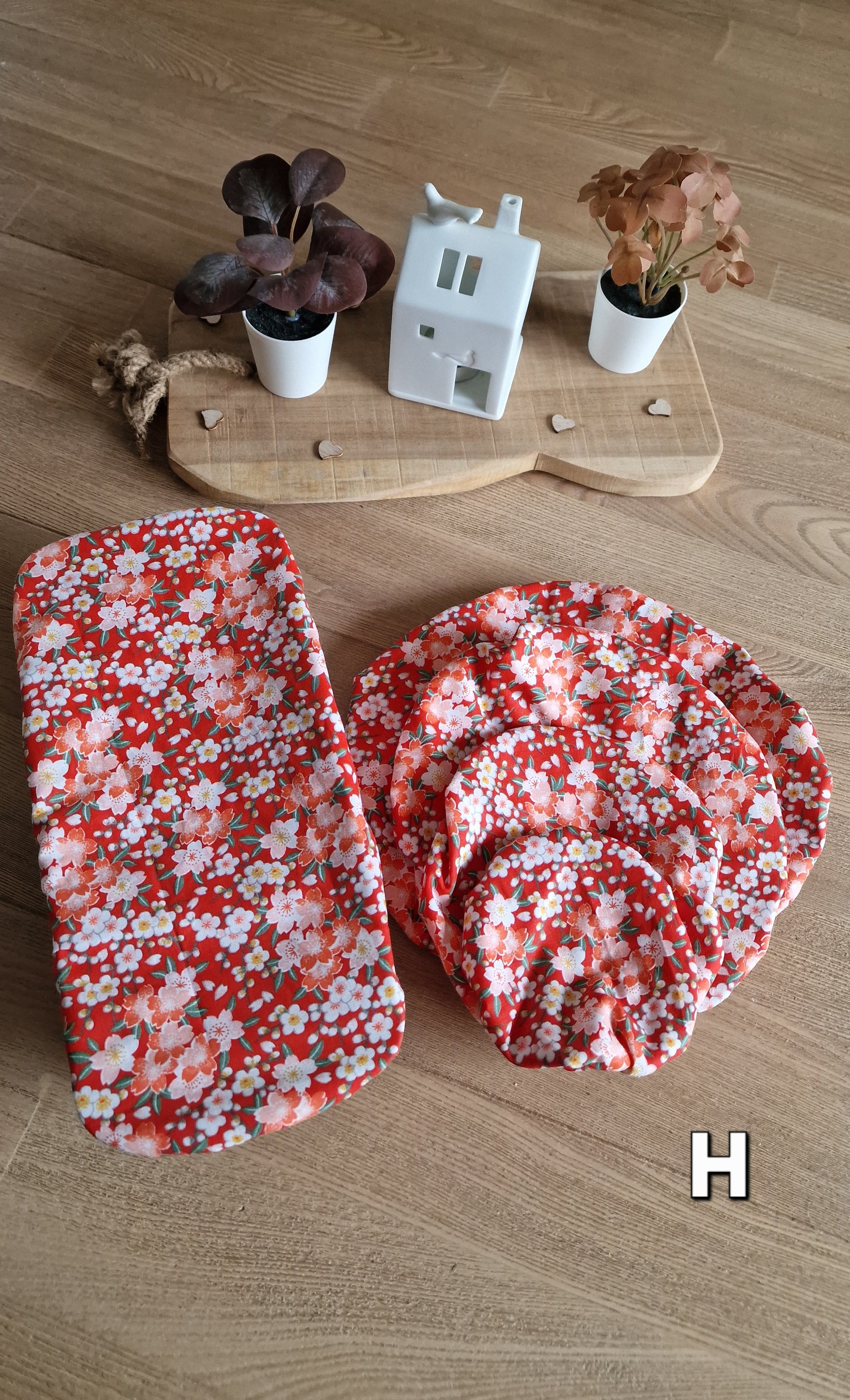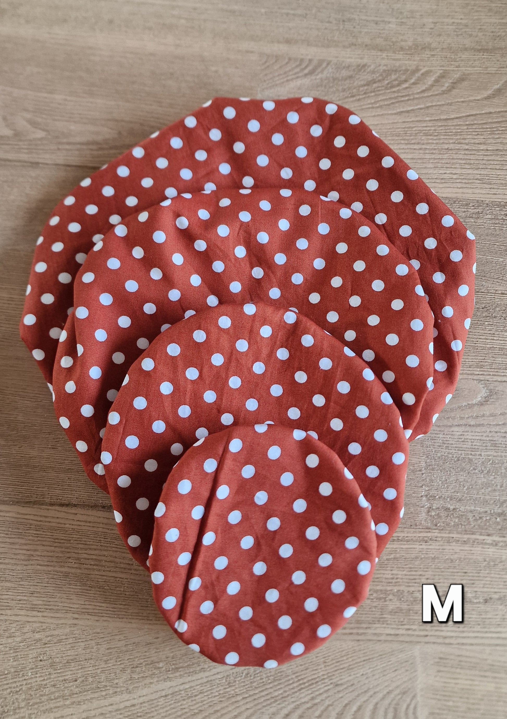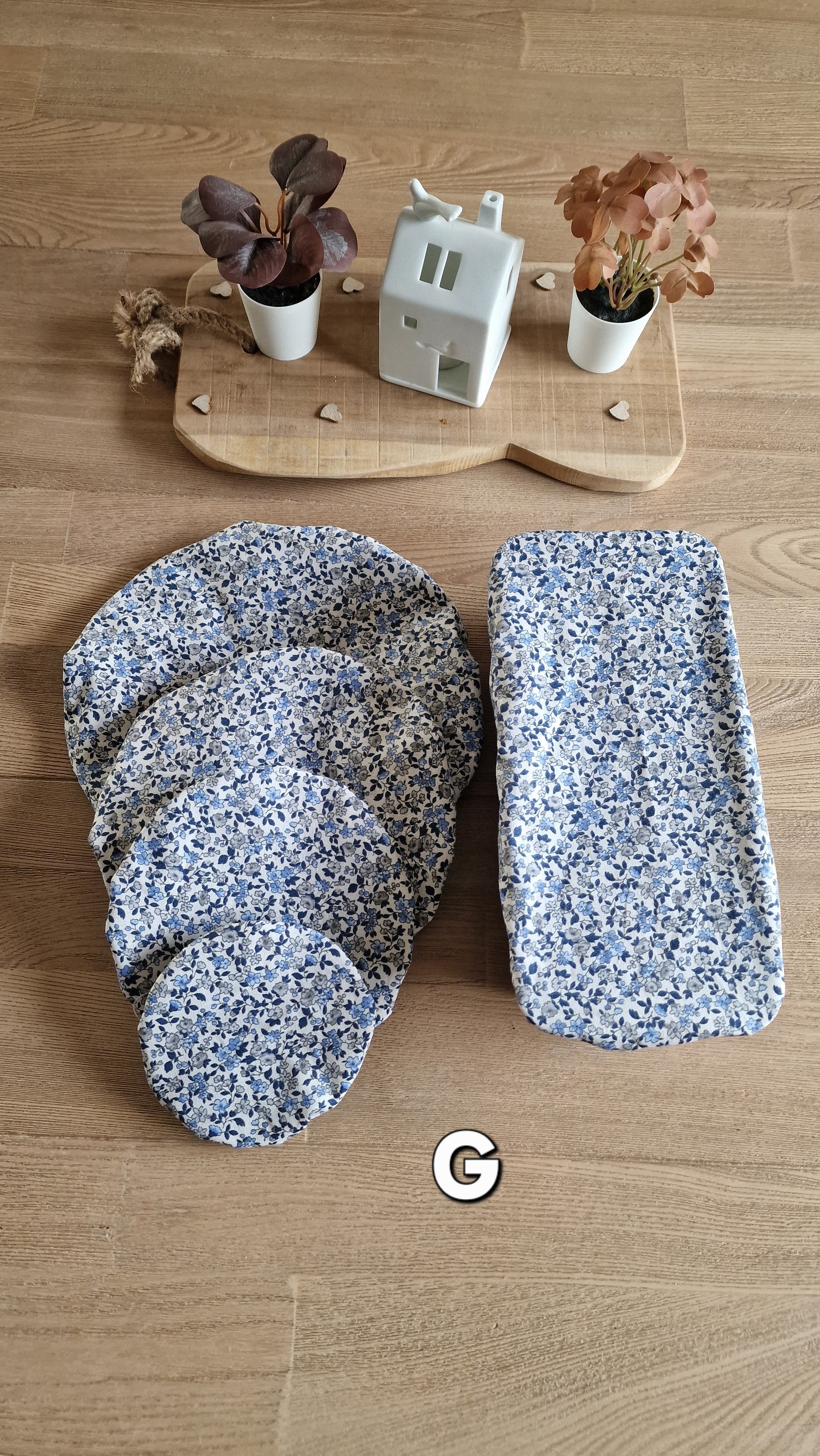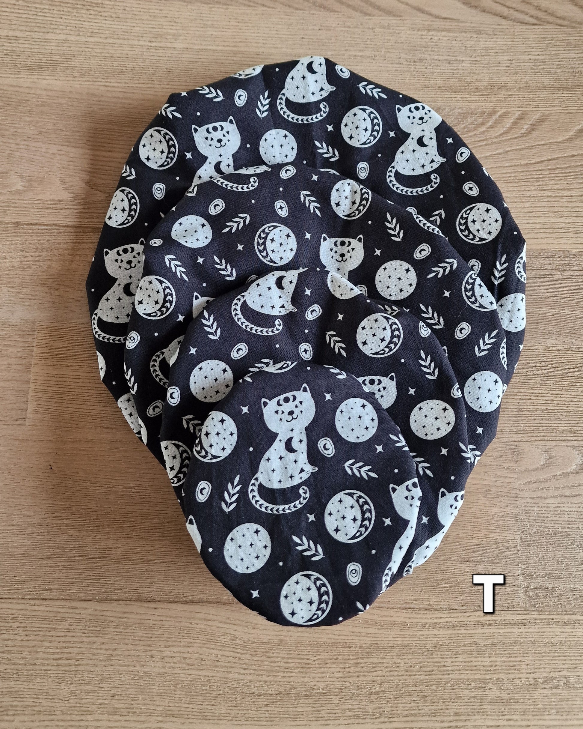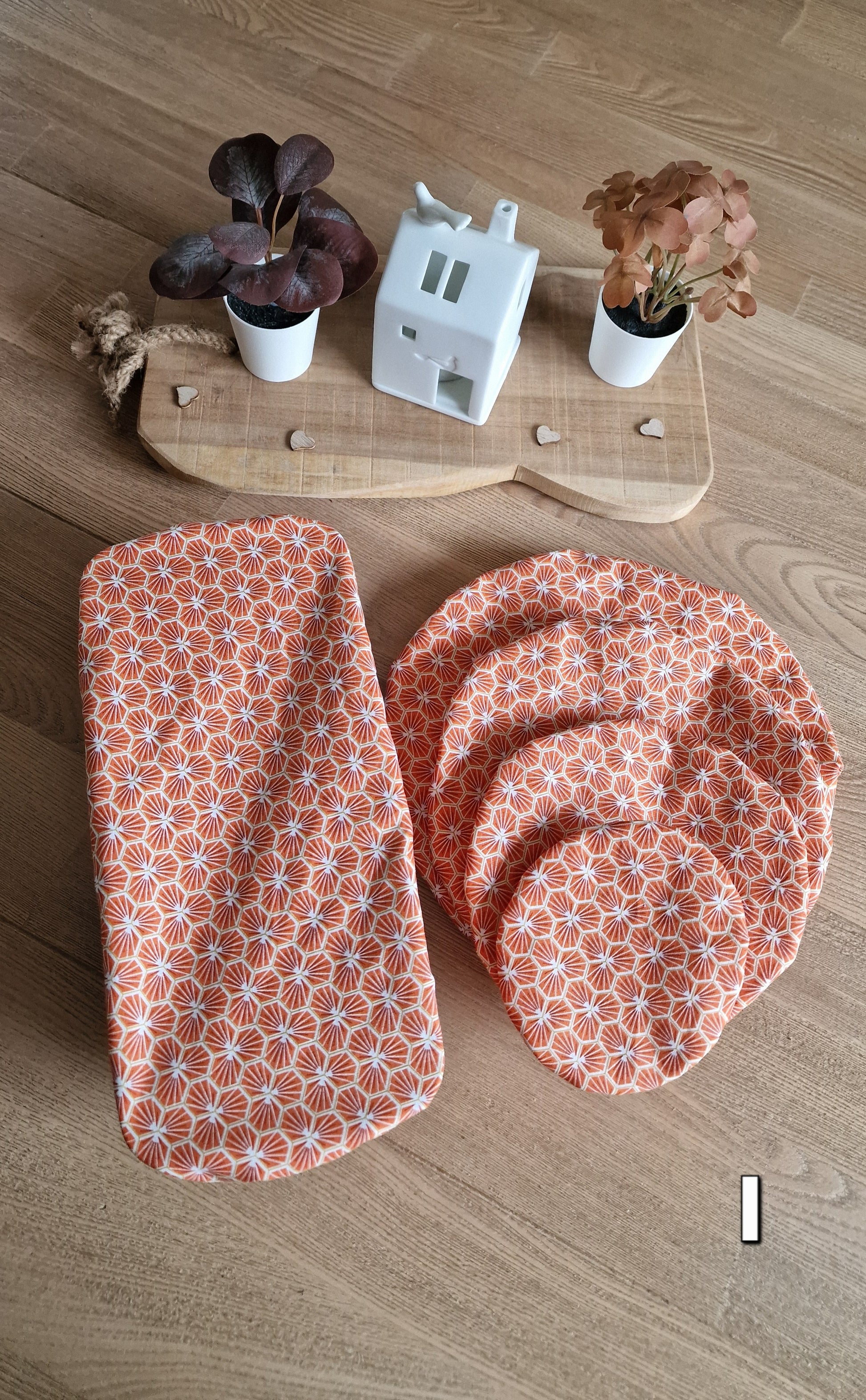 Ces couvres plat durables sont conçus pour être lavés. Le coton enduit ne craint pas les aliments et s’entretient facilement : vous pouvez simplement passer l’éponge après utilisation de la charlotte. Si les tâches sont incustées, il est possible de laver à 30°C ou 40°C en machine. Pas de sèche linge pour préserver l’élastique et l’étanchéité du tissu.