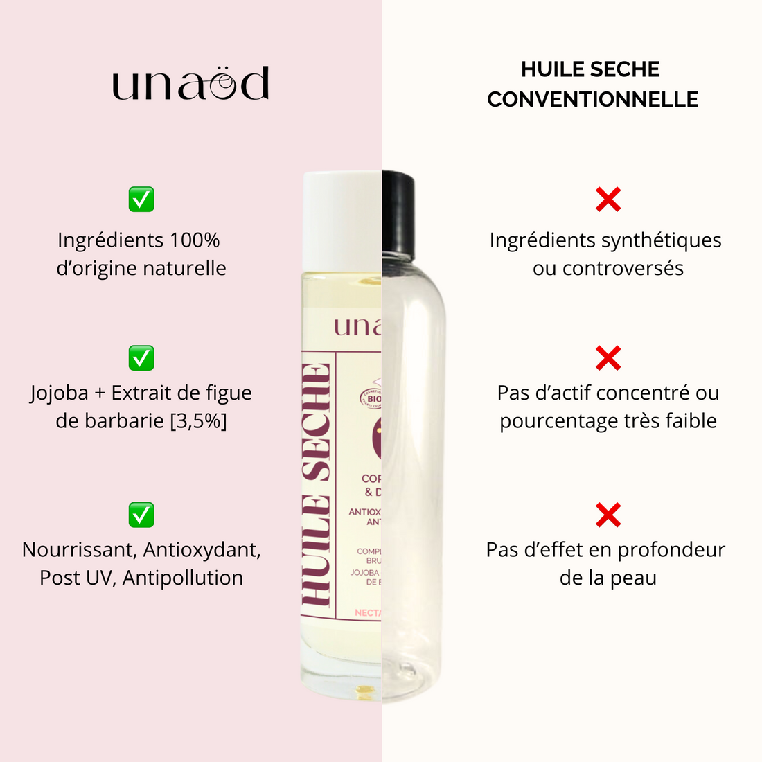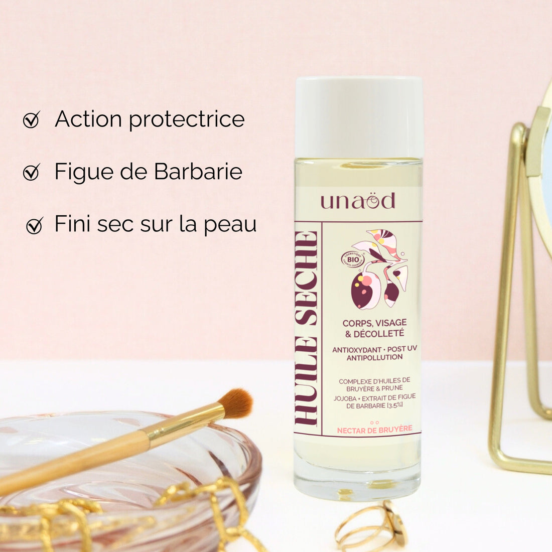 Succombez au complexe d'huiles botaniques précieuses de prune, jojoba et bruyère associé au concentré actif de figue de barbarie. Cette huile de soin accélère les facteurs naturels de régénération de la peau, aidant à atténuer les signes du vieillissement cutané. Idéale après une exposition au soleil, elle favorise l'activation globale des défenses naturelles de la peau face aux agressions extérieures (UV, pollution, stress oxydatif, âge). L'huile sèche apportera éclat et fini satiné sans laisser de film gras sur la peau.