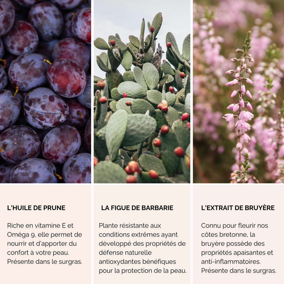 L’Huile de prune : Riche en vitamine E et en acide oléique (oméga 9), l’huile de prune est naturellement relipidante. Recommandée pour le maintien de l’hydratation cutanée, elle permet d’apporter du confort à la peau.