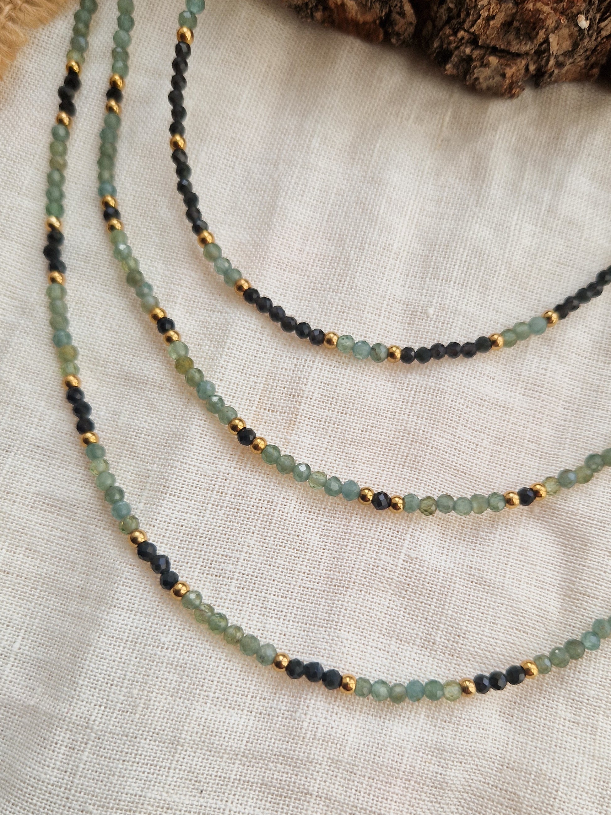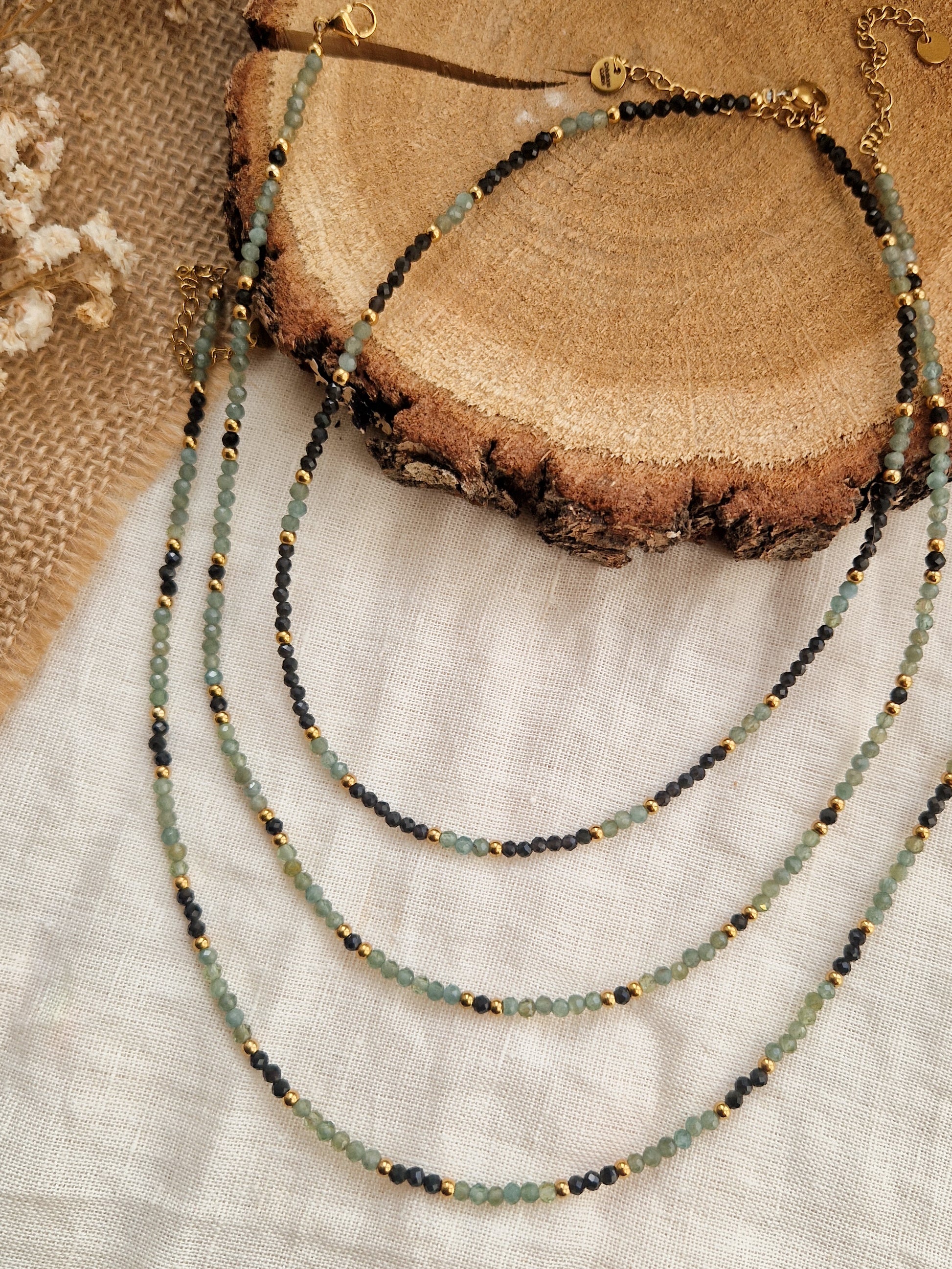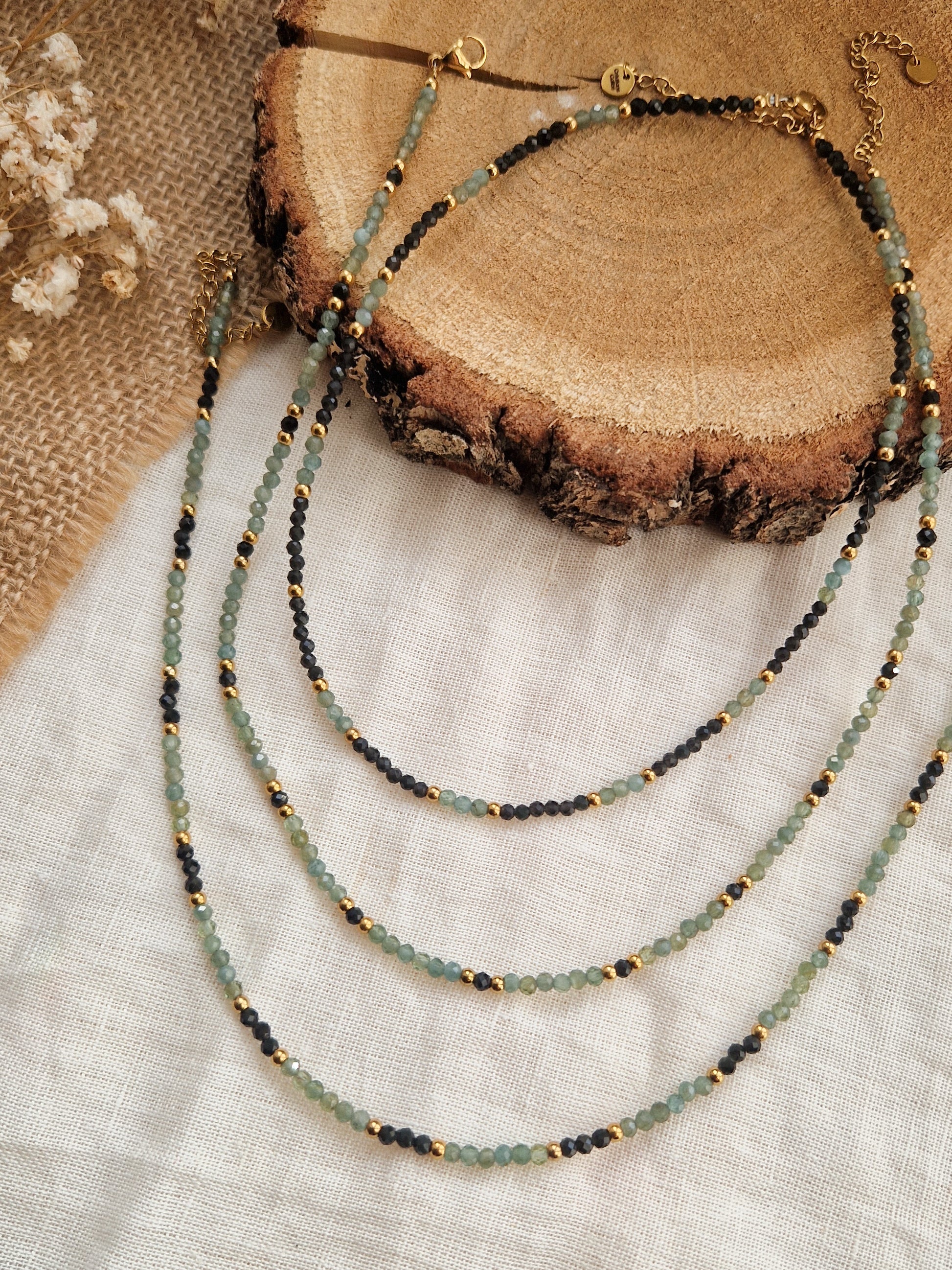 Ras de cou en apatite et obsidienne, avec des petites touches dorées en acier inoxydable