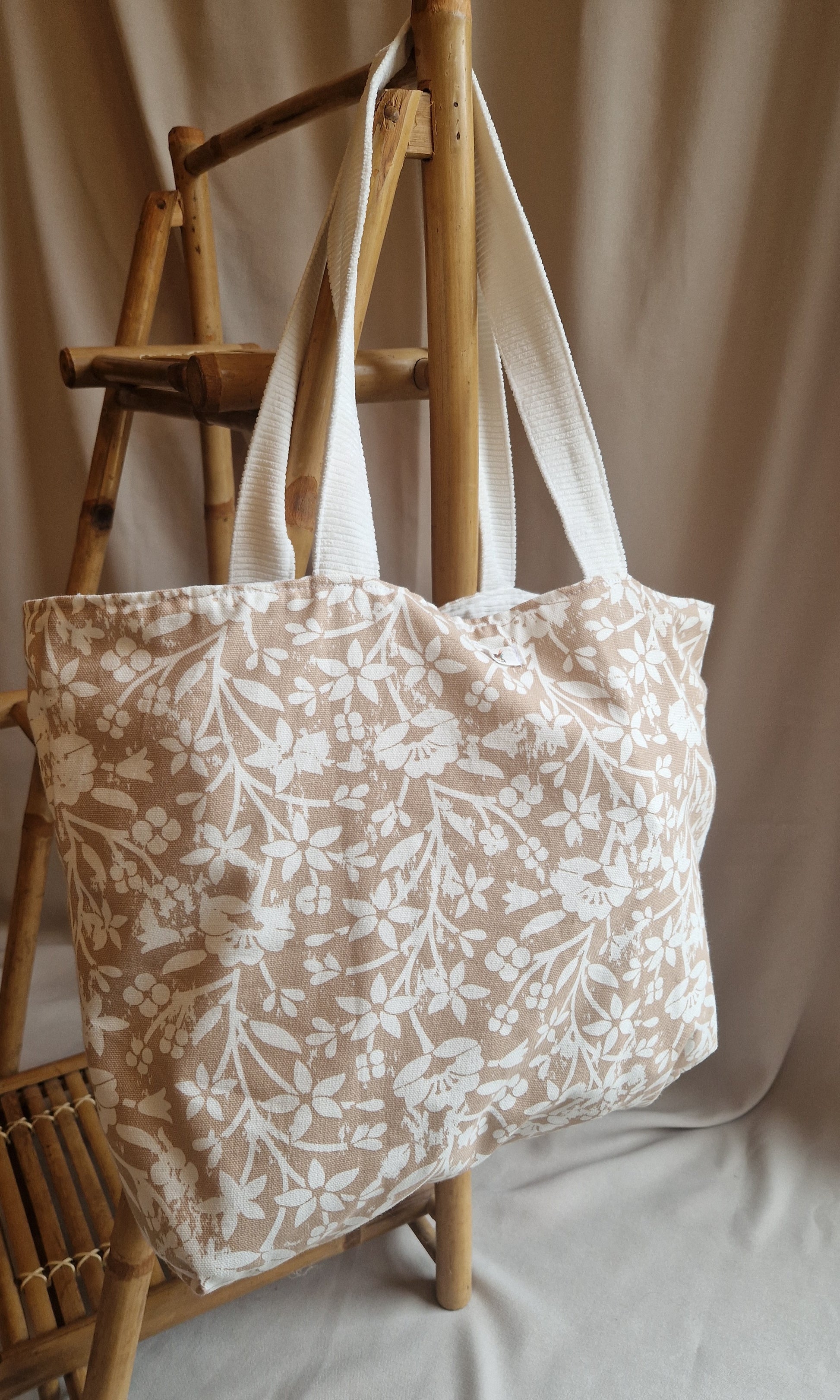 Né d’un besoin personnel : je ne trouvais pas le sac qui répondait parfaitement à mes besoins. J'ai créé à partir de velours côtelé et de coton imprimé, un mix entre un totebag pour ses longues anses, et un sac cabas pour sa grande contenance.