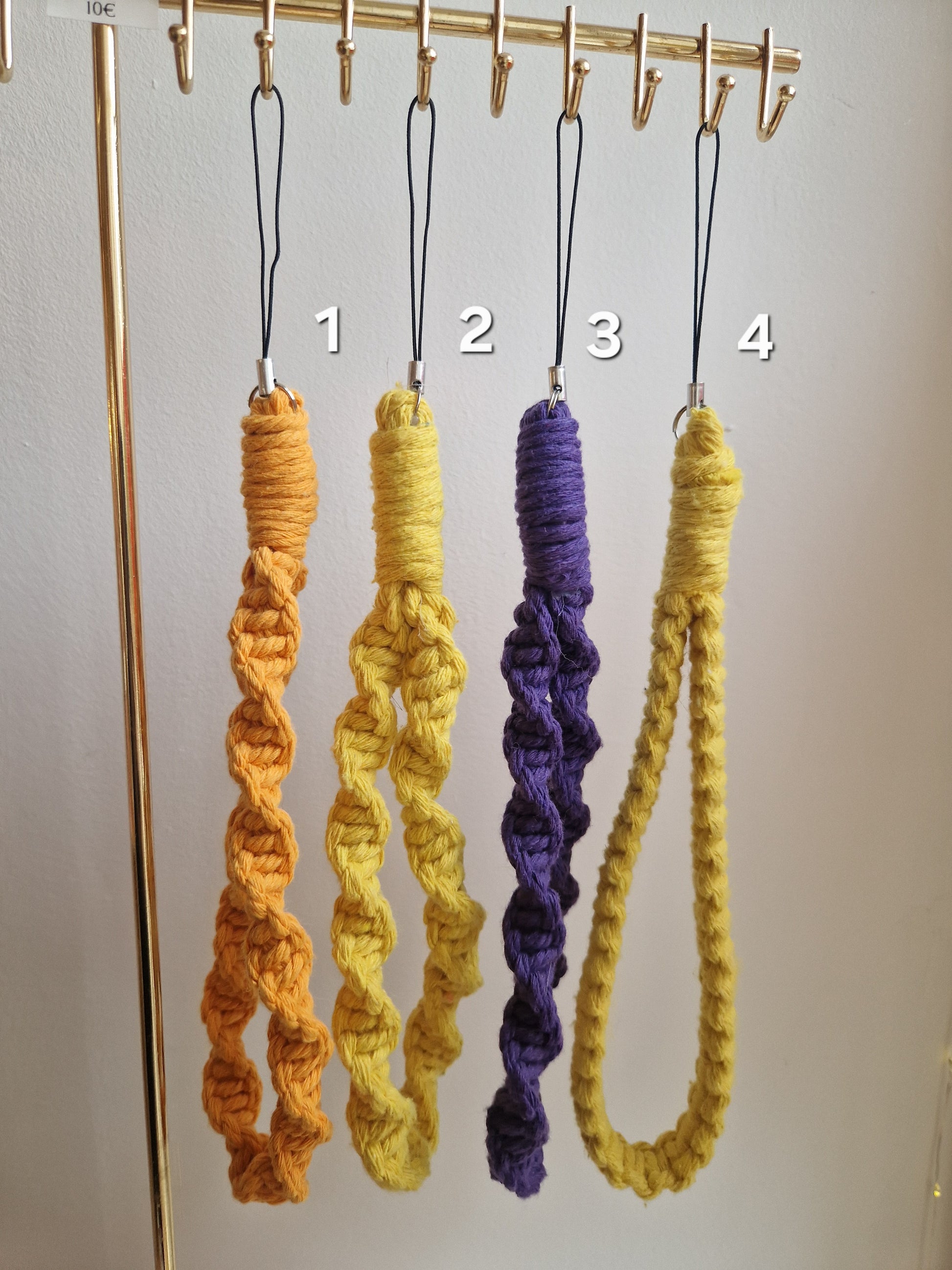 Sangles pour coque de téléphone réalisées avec la technique de tissage du macramé.